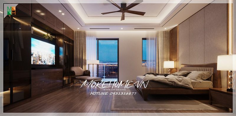 Thiết kế phòng ngủ với tủ âm tường liền kề tivi gỗ óc chó là một lựa chọn tối ưu để tiết kiệm diện tích căn phòng và tạo nên một không gian sang trọng và tiện nghi.